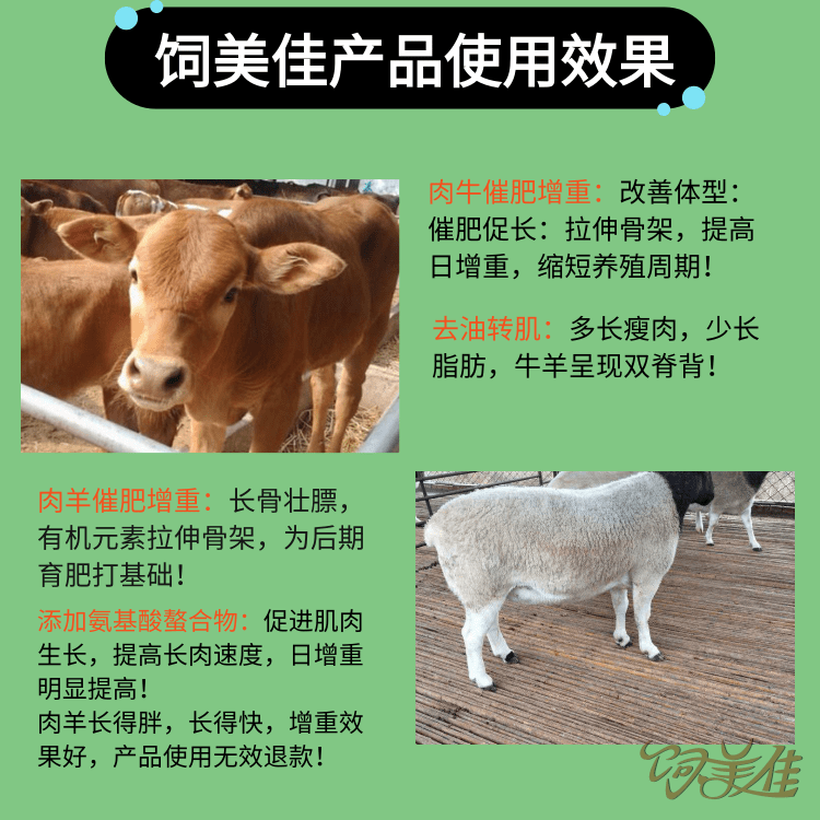 總之,如果您正在尋找效果好的牛羊催肥小料產(chǎn)品,飼美佳牛羊催肥劑,針對牛羊研發(fā),催肥促長效果好,見效快,值得一用。